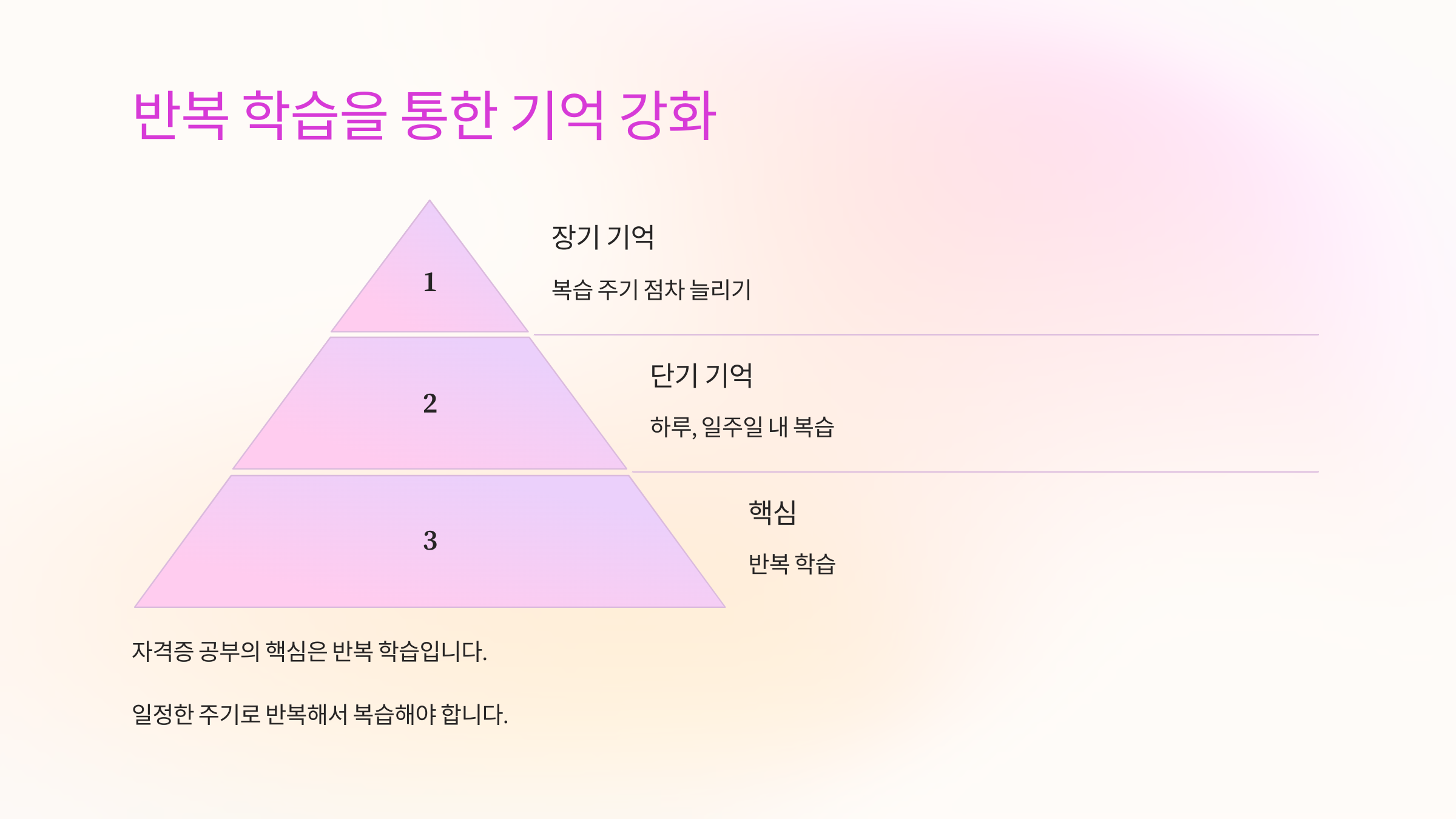 자격증 공부의 핵심은 반복 학습입니다. 한 번 학습한 내용을 잊어버리지 않기 위해서는 일정한 주기로 반복해서 복습해야 해요. 특히 처음 배운 내용은 하루 내에 복습하고, 일주일 뒤에 한 번 더 복습하는 방식이 효과적이에요.