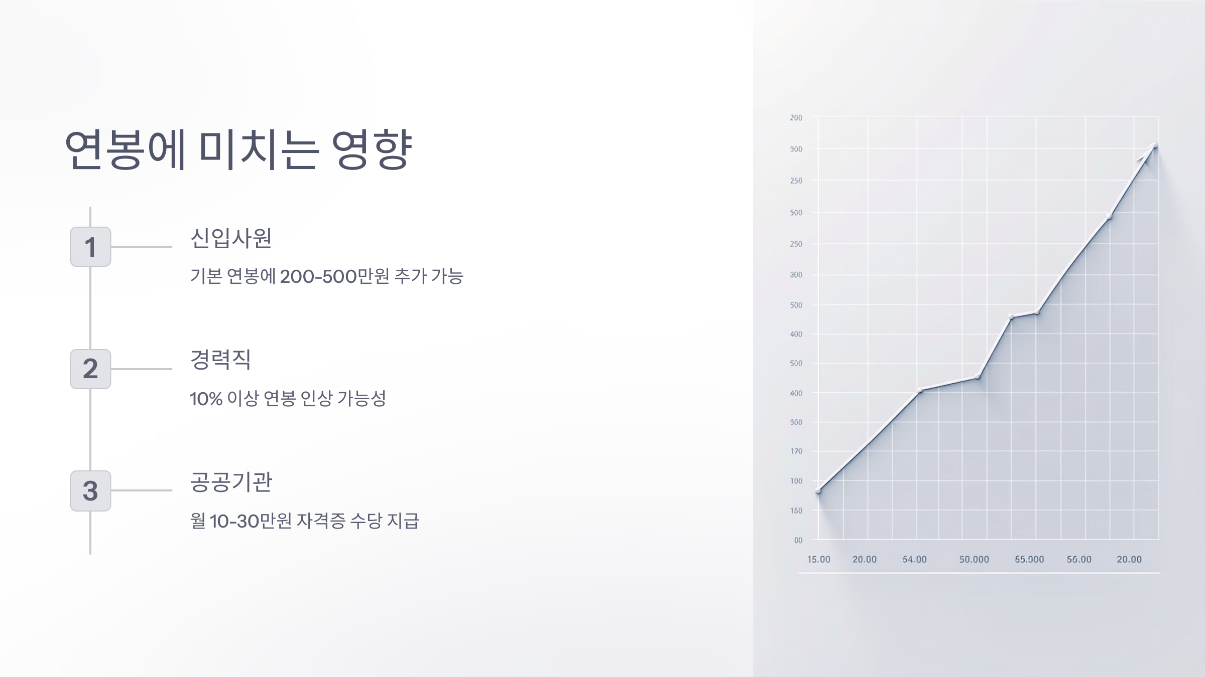 신입사원이 정보처리기사 자격증을 보유하고 있다면, 일반적으로 기본 연봉에서 추가로 200만 원에서 500만 원까지 더 받을 수 있어요. 특히, 자격증이 필수적으로 요구되는 대기업이나 공공기관에서는 신입사원 채용 시 자격증 보유자에게 가산점을 부여하고, 그에 따라 연봉 협상에서도 유리한 입지를 마련할 수 있죠.