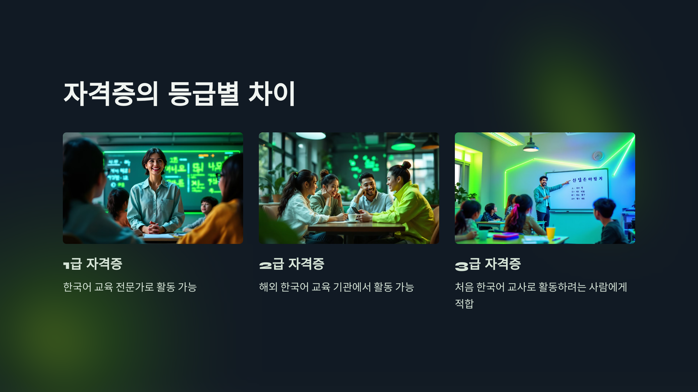 - 3급 자격증: 한국어교육 관련 과목을 이수한 후, 기본 실습을 통해 취득하는 자격증으로, 처음 한국어 교사로 활동하려는 사람들에게 적합해요. 해외에서 처음 경력을 쌓을 때 유용하며, 이후 경력을 쌓으면 2급, 1급으로 승급할 수 있어요.