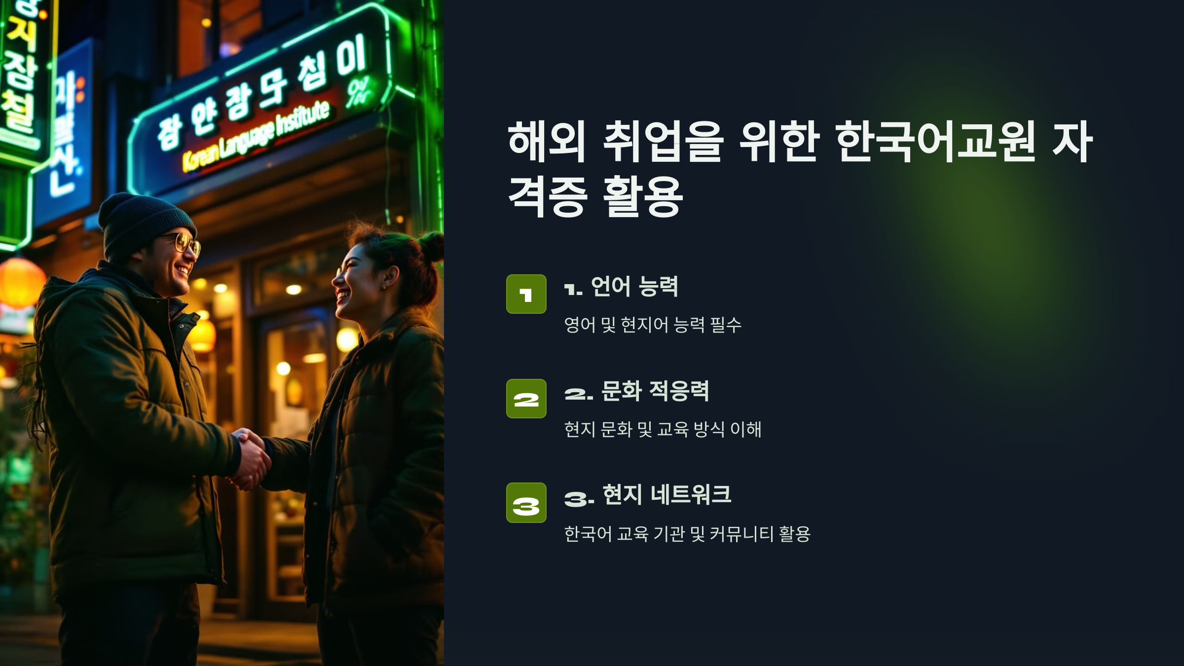 해외에서 한국어 교사로 취업하려면 현지 네트워크를 구축하는 것이 큰 도움이 됩니다. 해외 한국어 교육 기관이나 현지 대학과 협력 관계를 구축하거나, 관련 커뮤니티에 적극적으로 참여해 정보를 얻는 것이 중요해요.