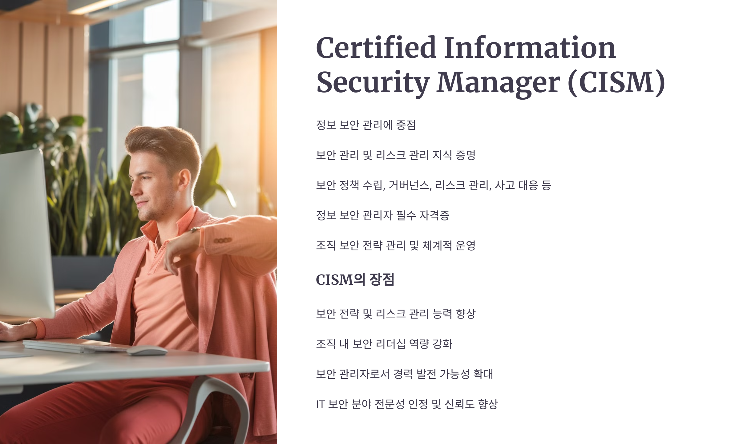 CISM은 조직의 보안 정책을 총괄하거나, 정보 보안 거버넌스와 리스크 관리를 담당하는 관리자로서 경력을 쌓고 싶은 사람에게 적합한 자격증입니다.