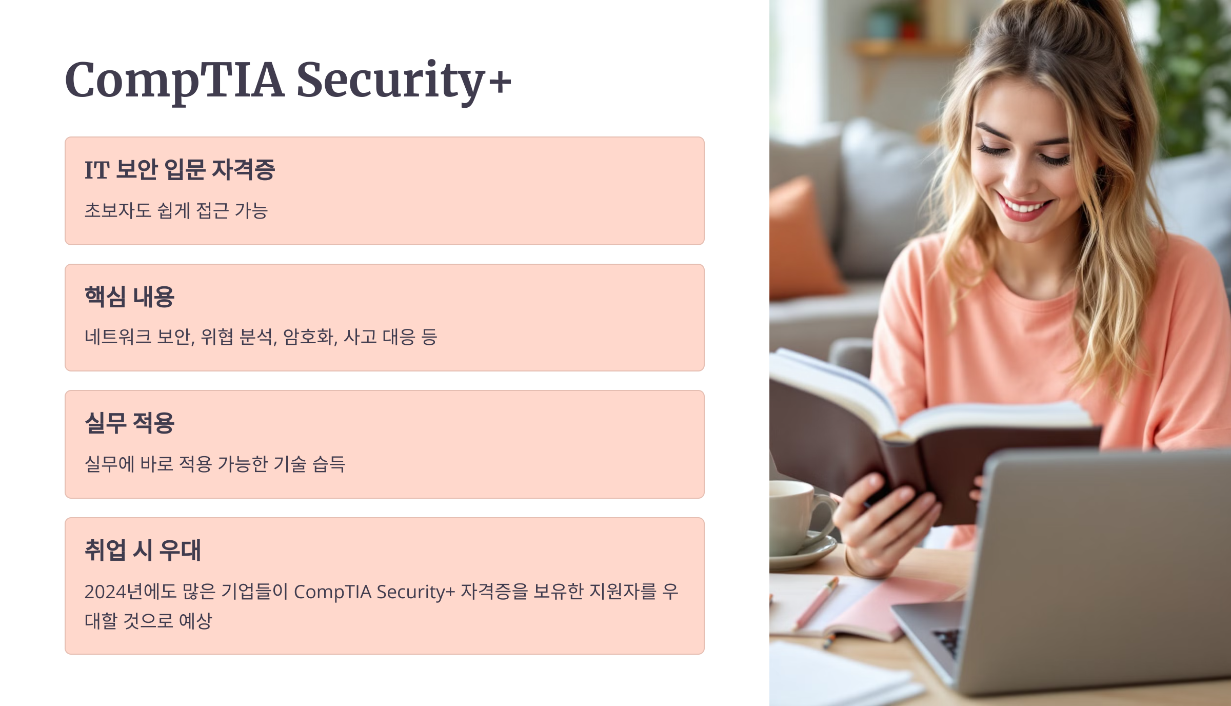 이 자격증은 보안 분야에서 커리어를 시작하려는 초급 보안 전문가에게 적합하며, 네트워크 및 정보 보안에 대한 기초 역량을 증명하는 자격증이에요.