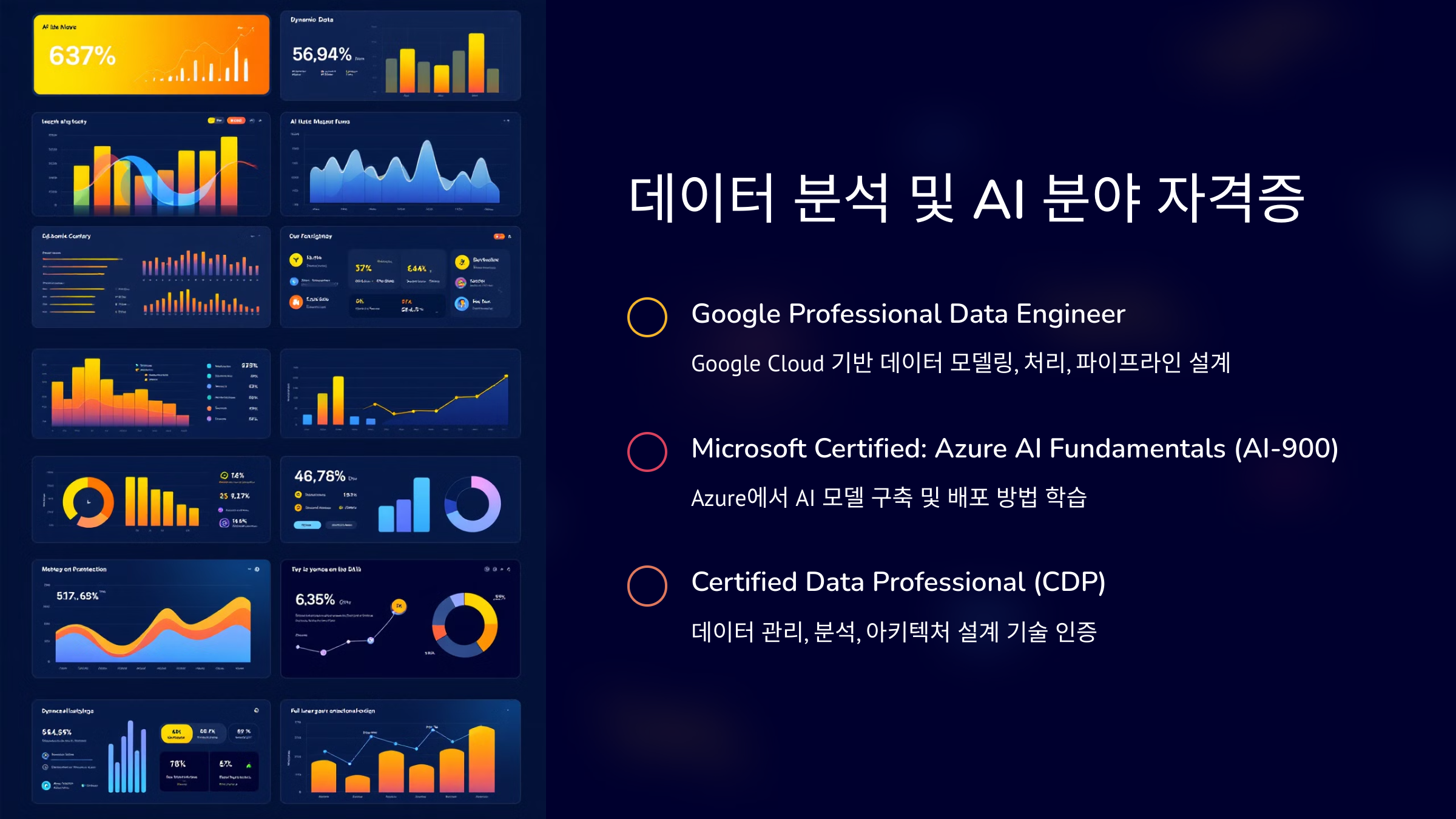 - 왜 유리한가요? 데이터 분석, 머신러닝 및 AI 프로젝트에서의 전문가로서 경쟁력을 높일 수 있으며, 데이터를 기반으로 비즈니스 의사 결정을 지원하는 데 필요한 기술을 인증받을 수 있습니다.