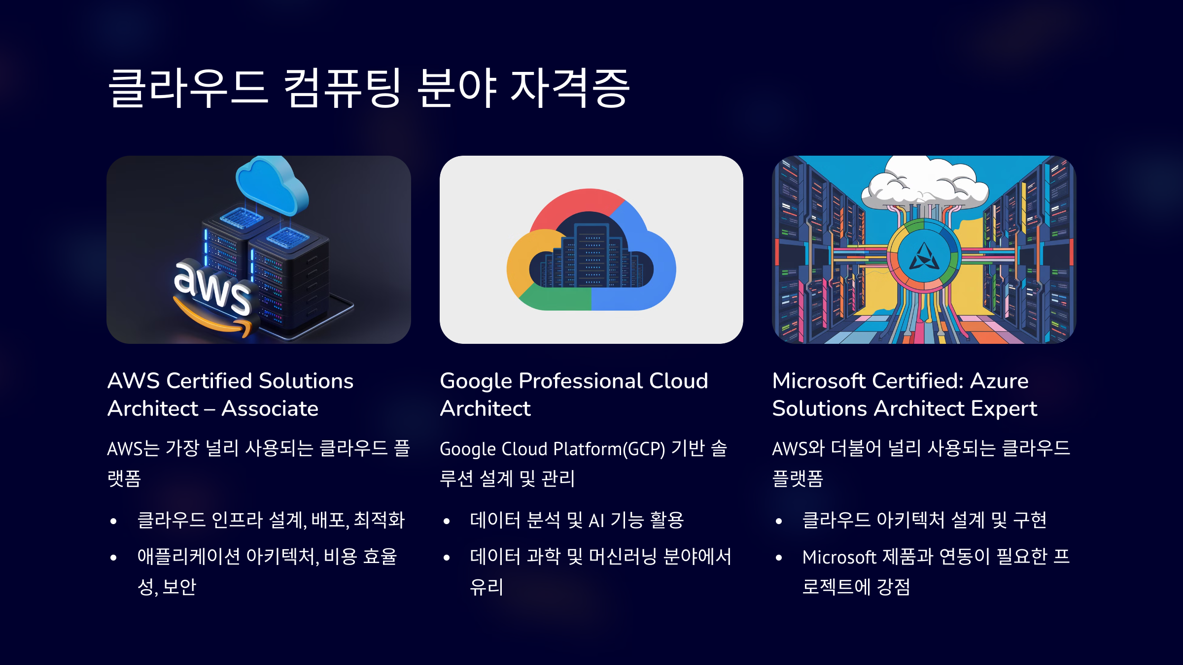 - **AWS(Amazon Web Services)**는 가장 널리 사용되는 클라우드 플랫폼 중 하나로, AWS Certified Solutions Architect 자격증은 클라우드 인프라 설계, 배포, 최적화 능력을 인증합니다.