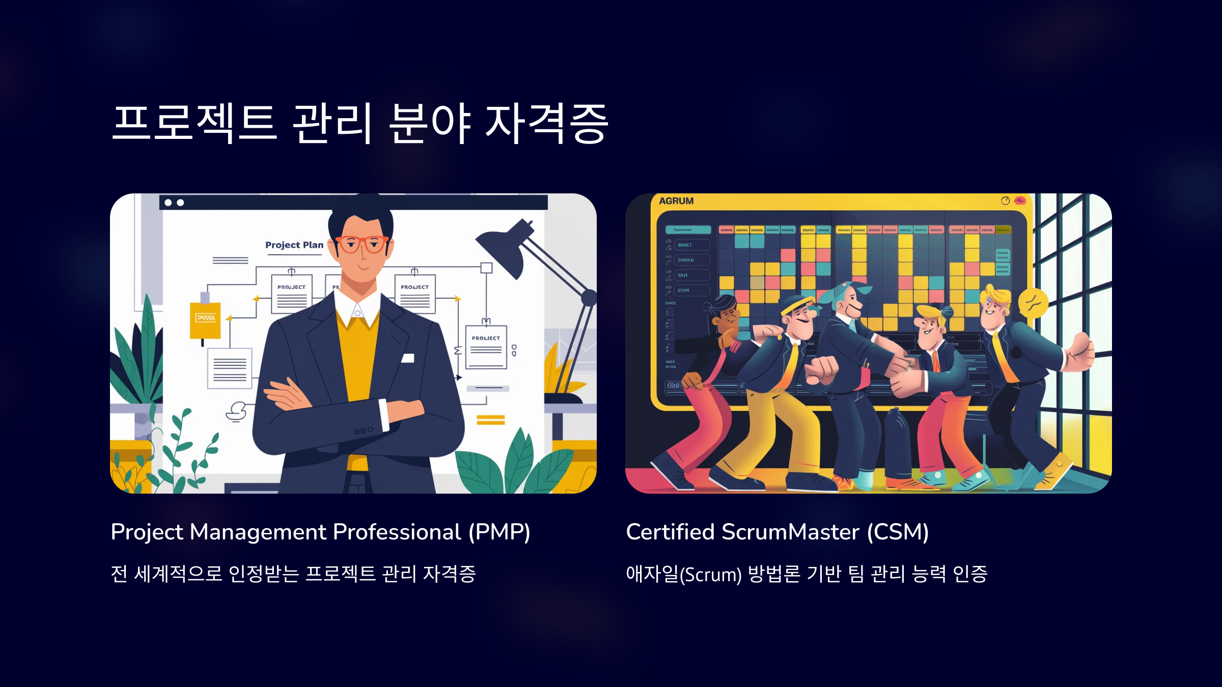 - 왜 유리한가요? 글로벌하게 인정받는 자격증으로, 프로젝트 매니저 직무에서 필수적인 자격증입니다.