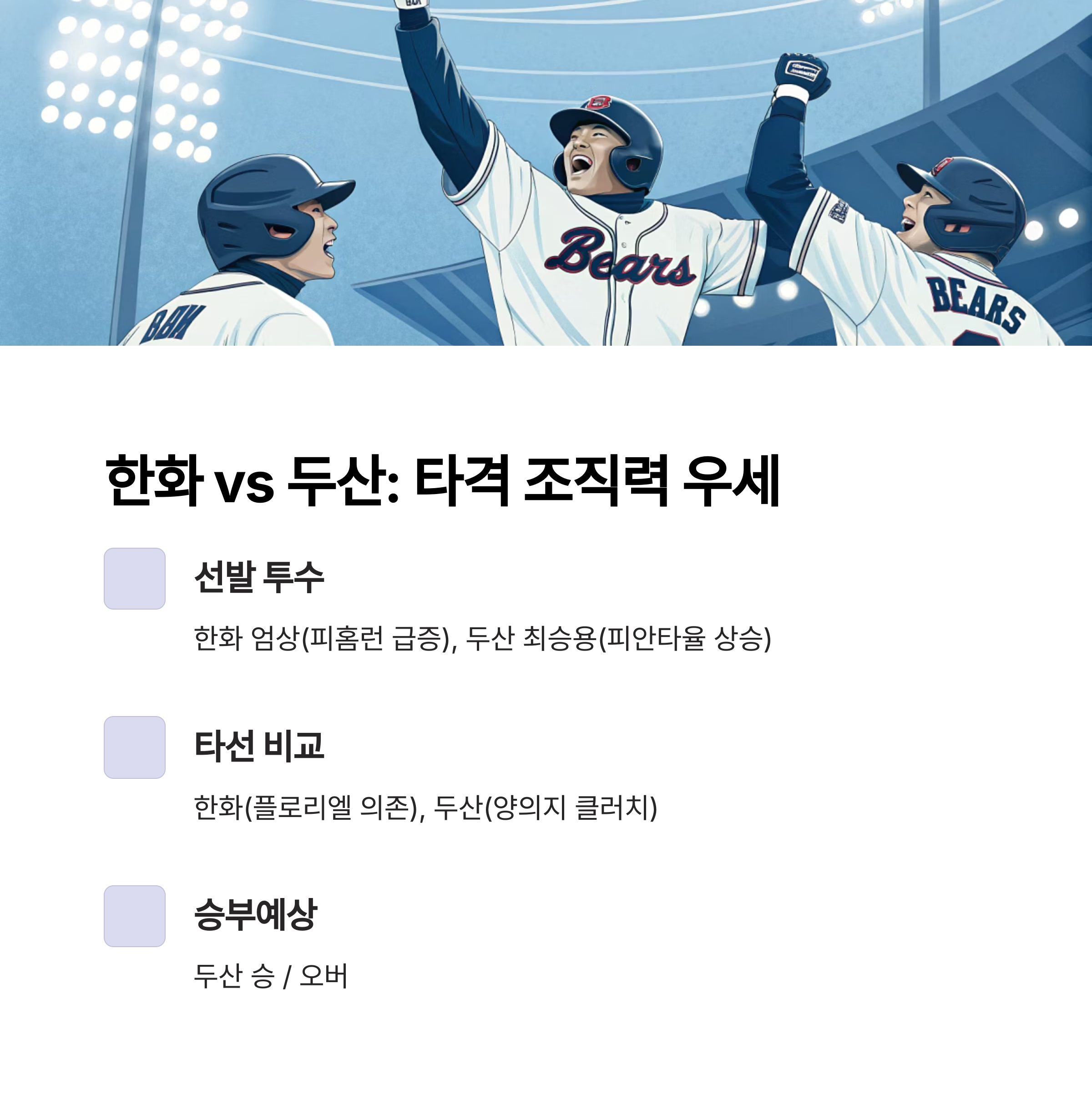 한화는 플로리엘 외에는 득점 루트가 제한적이며, 두산은 양의지 중심의 클러치 능력이 살아있습니다.